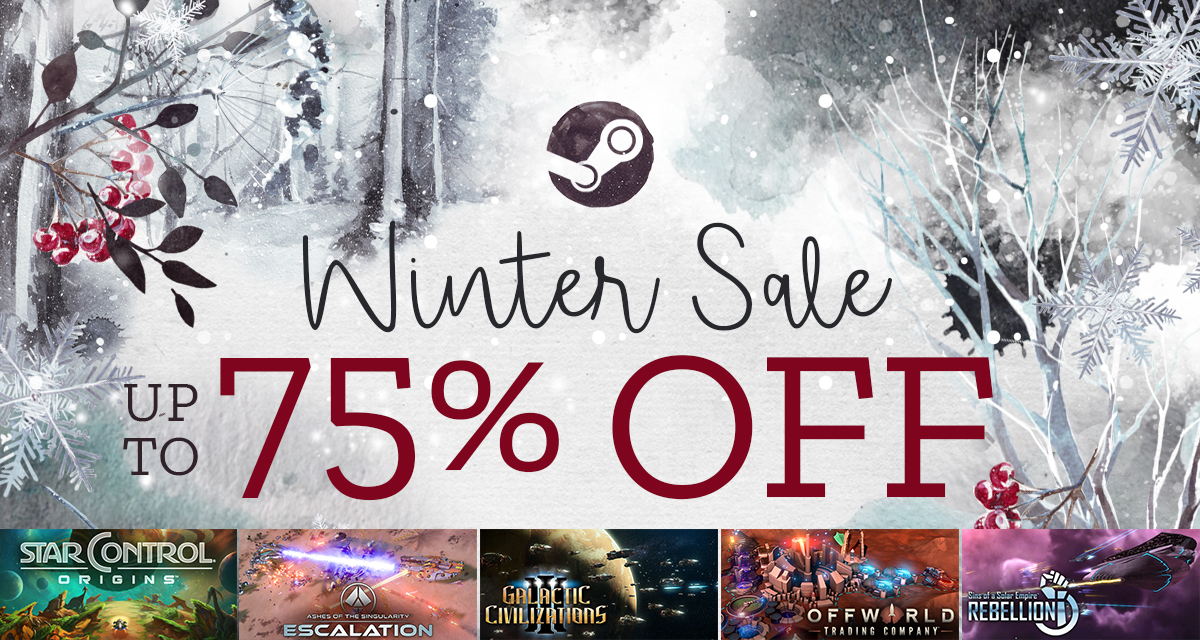 Steam's Winter Sale is here with up to 75% off* on our most popular titles! STEAM KEYS ARE PROVIDED WITH PURCHASE Star Control: Origins $29.99 Now $13.49 - 55% Off Galactic Civilizations III ( Includes FREE: Crusade and Retribution Expansions, Mega Events DLC) $39.99 Now $13.59 - 66% Off Ashes of the Singularity: Escalation $29.99 Now $13.49 - 55% Off Offworld Trading Company ( Includes FREE: ... [read more]